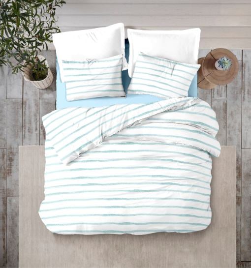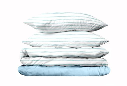 סט מצעים כותנה פרקל 270 – CLASSIC אשר מגיע עם סדין תכלת, ציפה וציפיות רקע לבן דפוס פסים א-סימטריים בגווני תכלת.